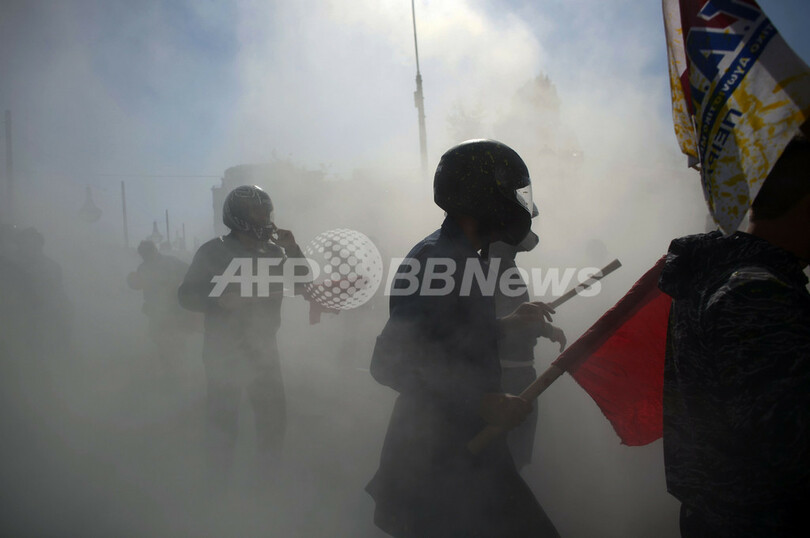 一方、ゼネスト2日目の同日、採決が行われる首都アテネ(Athens)の国会議事堂前のシンタグマ広場(Syntagma Square)には約3万5000人のデモ参加者が集結し、一部が警官隊と衝突。1人が死亡した。