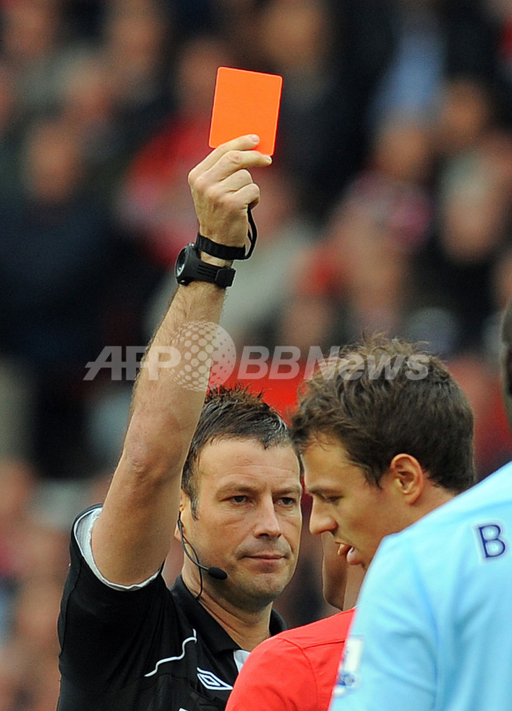 後半1分、マンチェスター・ユナイテッドのジョニー・エヴァンス(Jonny Evans、右)にレッドカードを提示するマーク・クラッテンバーグ主審(Mark Clattenburg、2011年10月23日撮影)。(c)AFP/ANDREW YATES