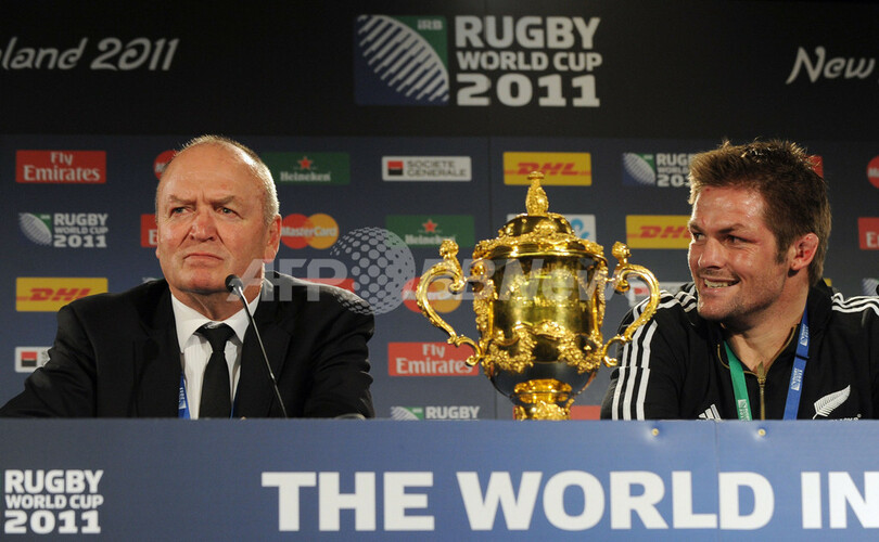 試合後の記者会見に臨むオールブラックスのリッチー・マッコウ(Richie McCaw、左)とグレアム・ヘンリーHC(Graham Henry)(2011年10月23日撮影)。(c)AFP/WILLIAM WEST