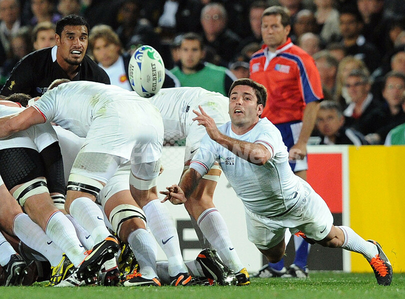 パスを出すフランスのディミトリ・ヤシュヴィリ(Dimitri Yachvili、2011年10月23日撮影)。(c)AFP/GABRIEL BOUYS