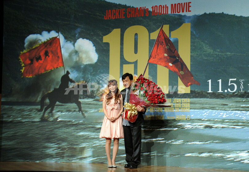 【10月22日 AFP】俳優ジャッキー・チェン(Jackie Chan)が21日、主演・監督を務め、さらに100本目の出演作となる映画『1911』の記者会見を都内で開いた。会見にはタレントの中川翔子(Shoko Nakagawa)さんも登場し、ジャッキーに花束を渡した。『1911』は22日に「東京国際映画祭(Tokyo International Film Festival、TIFF)」で上映された後、11月5日から公開される。(c)AFP