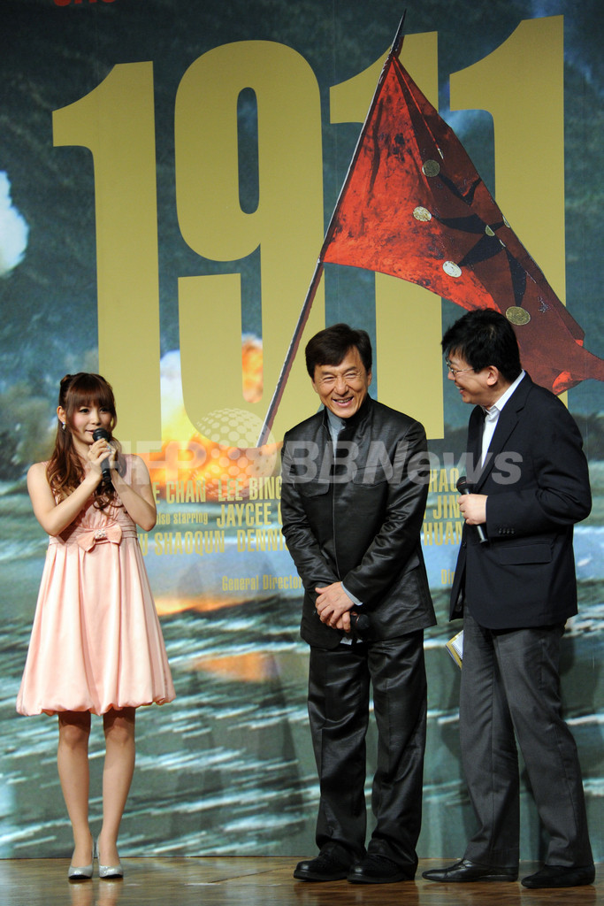 【10月22日 AFP】俳優ジャッキー・チェン(Jackie Chan)が21日、主演・監督を務め、さらに100本目の出演作となる映画『1911』の記者会見を都内で開いた。会見にはタレントの中川翔子(Shoko Nakagawa)さんも登場し、ジャッキーに花束を渡した。『1911』は22日に「東京国際映画祭(Tokyo International Film Festival、TIFF)」で上映された後、11月5日から公開される。(c)AFP