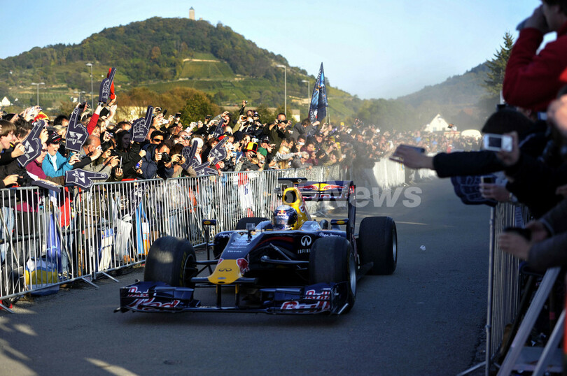 【10月23日 AFP】2011年シーズンのフォーミュラワン(F1、F1世界選手権)年間総合王者に輝いたレッドブル(Red Bull)のセバスチャン・ベッテル(Sebastian Vettel)は22日、地元ドイツのヘッペンハイム(Heppenheim)で凱旋イベントを行い、2年連続の年間総合王者獲得を成し遂げた自身のマシンである、「キンキー・カイリー(Kinky Kylie)」で街中をデモ走行した。