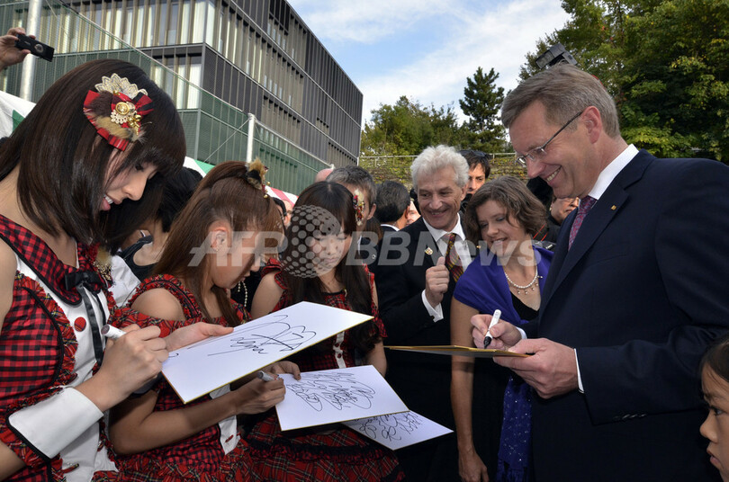 ニュース 政治・経済 ドイツ大統領、AKB48とサイン交換 日独交流150周年イベント 2011年10月23日 19:00 発信地:東京 [ アジア・オセアニア 東京 ] このニュースをシェア ‹ › ❮ 3/7 ❯ 来日中のクリスチャン・ウルフ(Christian Wulff)独大統領は23日、都内のドイツ大使館で開かれた日独交流150周年記念イベントで、日本のアイドルグループAKB48とサイン交換を行った。ウルフ大統領は6日間の日程で来日中。写真は、ウルフ大統領(右)とサインを交換するAKB48メンバーの(左から)藤江れいな(Reina Fujie)、高橋みなみ(Minami Takahashi)、仁藤萌乃(Moeno Nito、2011年10月23日撮影)。(c)AFP/Yoshikazu TSUNO 画像作成中 ! 【10月23日 AFP】来日中のクリスチャン・ウルフ(Christian Wulff)独大統領は23日、都内のドイツ大使館で開かれた日独交流150周年記念イベントで、日本のアイドルグループAKB48とサイン交換を行った。ウルフ大統領は6日間の日程で来日中。(c)AFP 政治・経済 一覧へ> メディア・報道関係・法人の方向け 写真・動画 購入のお問合せ>
