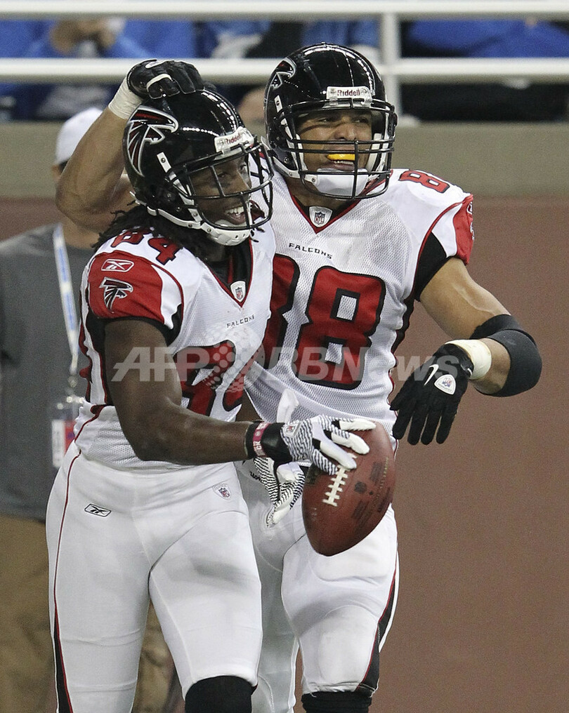 タッチダウンを決めトニー・ゴンザレス(Tony Gonzales、右)と喜ぶアトランタ・ファルコンズのロディ・ホワイト(Roddy White、2011年10月23日撮影)。(c)AFP/Getty Images/Leon Halip