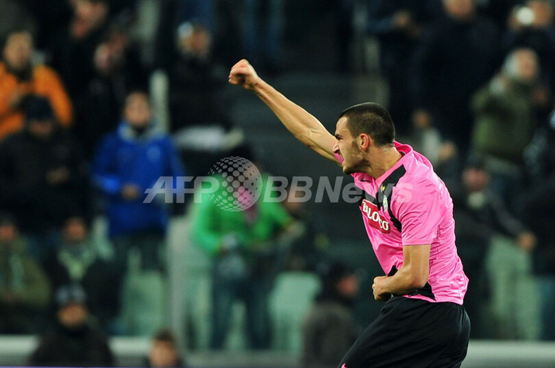 前半13分に先制点を挙げて歓喜するユベントスのレオナルド・ボヌッチ(Leonardo Bonucci、2011年10月25日撮影)。(c)AFP/GIUSEPPE CACACE