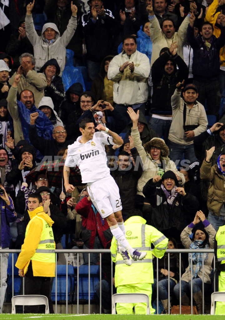 前半31分にチーム3得点目を挙げて歓喜するレアル・マドリードのアンヘル・ファビアン・ディ・マリア(Angel Fabian Di Maria、2011年10月26日撮影)。(c)AFP/JAVIER SORIANO