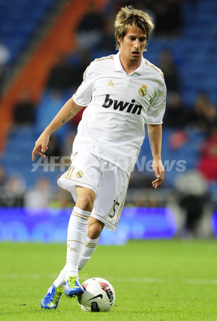 ボールをキープするレアル・マドリードのファビオ・コエントラン(Fabio Coentrao、2011年10月26日撮影)。(c)AFP/JAVIER SORIANO