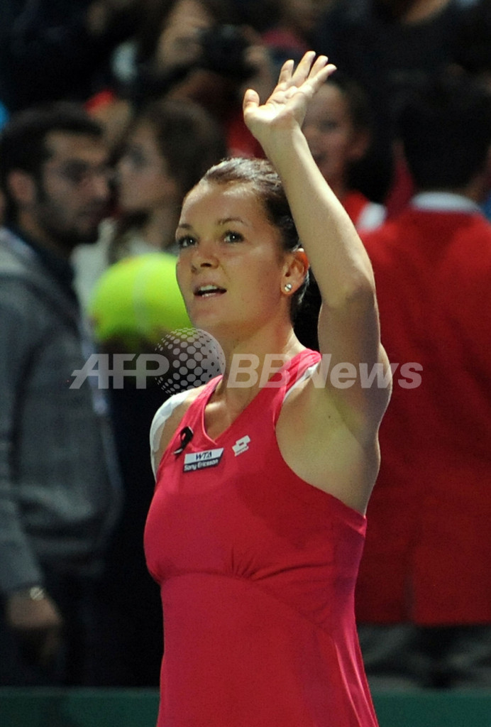 試合に勝利し歓声に応えるアニエスカ・ラドワンスカ(2011年10月27日撮影)。(c)AFP/BULENT KILIC