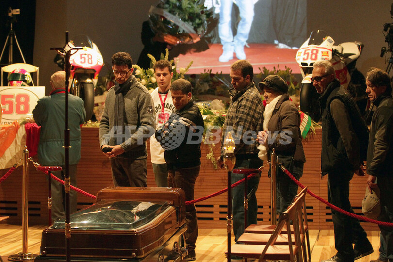 市内には多くのファンが訪れたほか、ミサノ・サーキット(Misano race-track)では数千人が中継された葬儀の映像を観てシモンセッリに最後の別れを告げた。(c)AFP