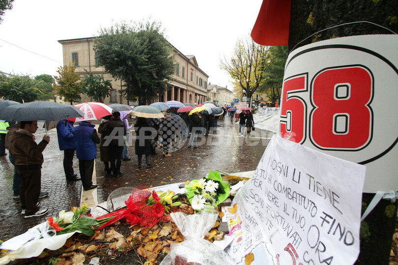 市内には多くのファンが訪れたほか、ミサノ・サーキット(Misano race-track)では数千人が中継された葬儀の映像を観てシモンセッリに最後の別れを告げた。(c)AFP