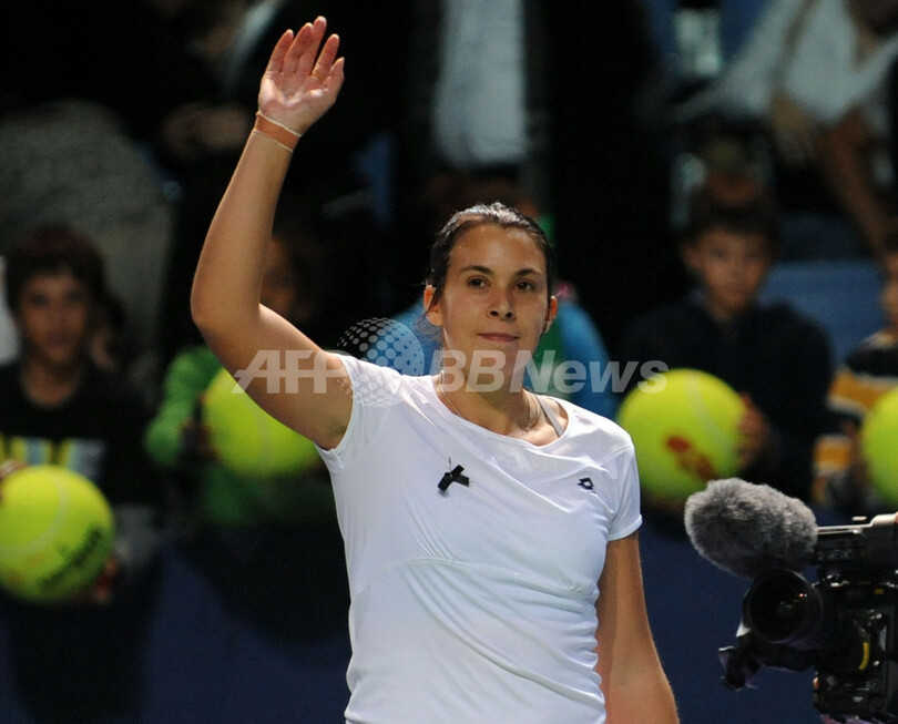 勝利し、歓声に応えるマリオン・バルトリ(2011年10月28日撮影)。(c)AFP/BULENT KILIC