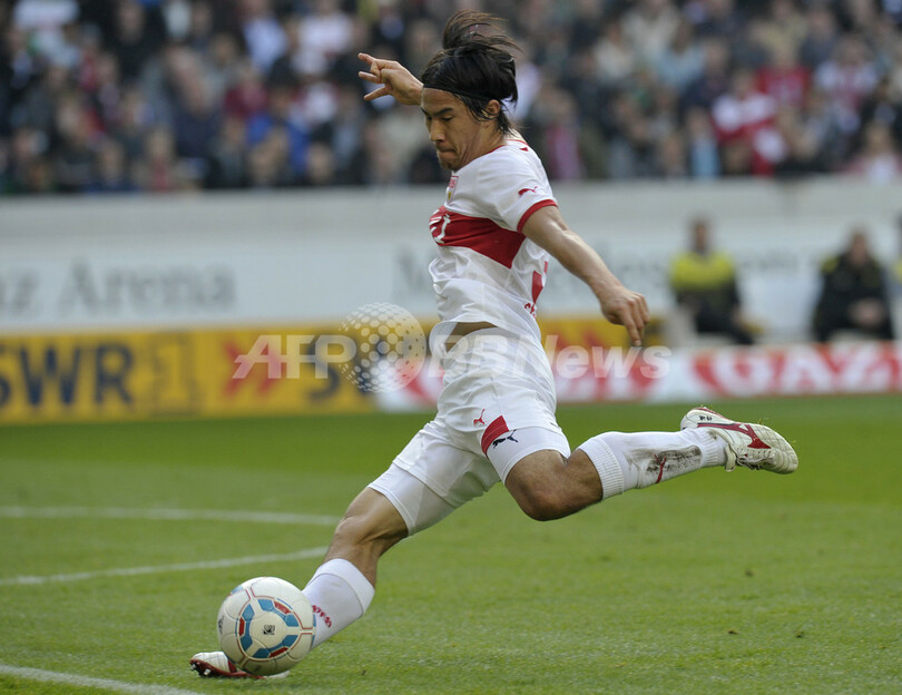 シュートを打つVfBシュツットガルトの岡崎慎司(Shinji Okazaki、2011年10月29日撮影)。(c)AFP/THOMAS KIENZLE