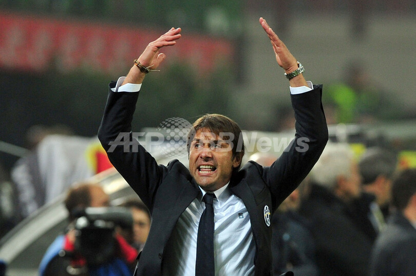 試合に勝利し、歓喜するユベントスのアントニオ・コンテ監督(Antonio Conte、2011年10月29日撮影)。(c)AFP/GIUSEPPE CACACE