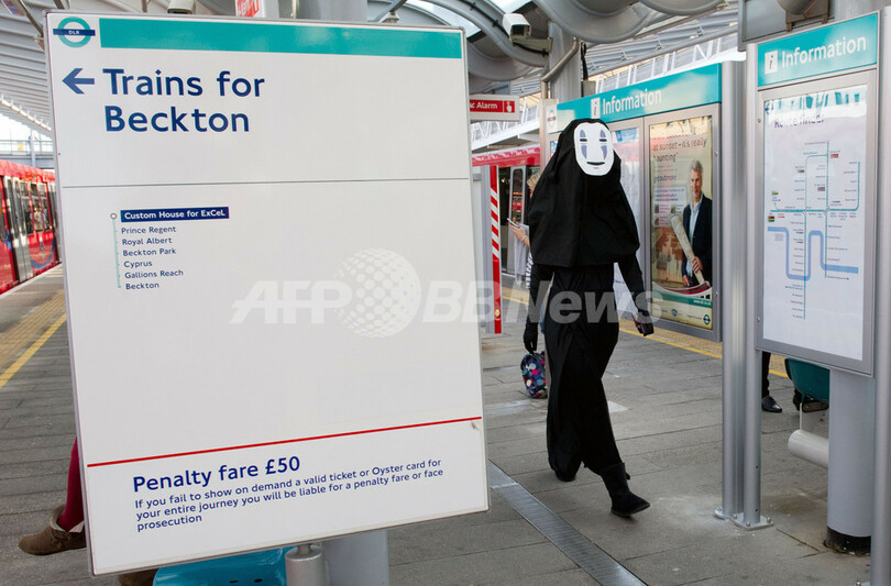 英ロンドン(London)東部のエクセル(ExCel)センターで前週末、ロンドン・コミックコン(London Comic Con)が開催された。写真は、「千と千尋の神隠し」のカオナシ(No-Face)のコスプレをした来場者(2011年10月29日撮影)。(c)AFP/LEON NEAL