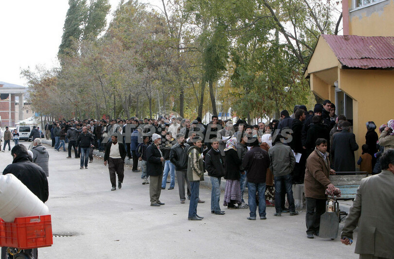 写真は東部ワン(Van)県で、支援物資を受け取る列に並ぶ住民(2011年10月29日撮影)。(c)AFP/ADEM ALTAN