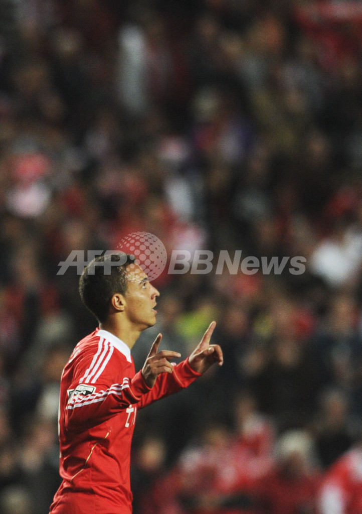 前半13分にこの試合2点目となるゴールを決め、歓喜するベンフィカのロドリゴ(Rodrigo Moreno Machado、2011年10月29日撮影)。(c)AFP/PATRICIA DE MELO MOREIRA