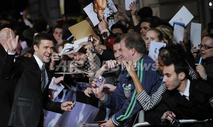 ジャスティン・ティンバーレイク(Justin Timberlake)とアマンダ・セイフライド(Amanda Seyfried)が共演する新作映画『TIME/タイム(In Time)』のプレミア上映会が10月31日、英ロンドン(London)で開催された。同作品の日本公開は来年になる予定。写真は、レッドカーペットに登場したティンバーレイク(2011年10月31日撮影)。(c)AFP/FACUNDO ARRIZABALAGA