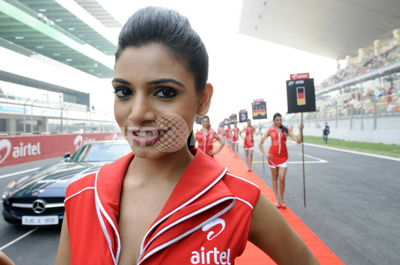 インドのグレーター・ノイダ(Greater Noida)にあるブッダ国際サーキット(Buddh International circuit)で10月30日に行われた11F1第17戦インドGP(India Grand Prix 2011)決勝に登場したレースクイーンたち。(2011年10月30日撮影)。(c)AFP/TOSHIFUMI KITAMURA