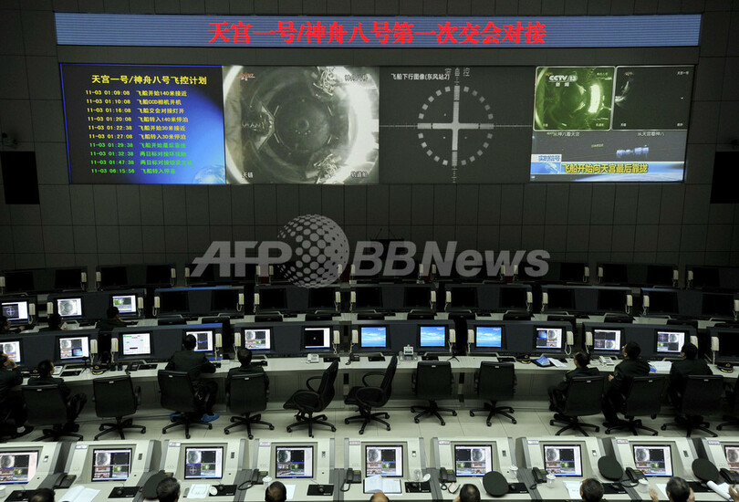 【11月3日 AFP】(写真追加)中国の国営新華社(Xinhua)通信は3日、中国の無人宇宙船「神舟8号(Shenzhou VIII)」が同日未明、実験用モジュール「天宮1号(Tiangong-1)」とのドッキングに成功したと報じた。