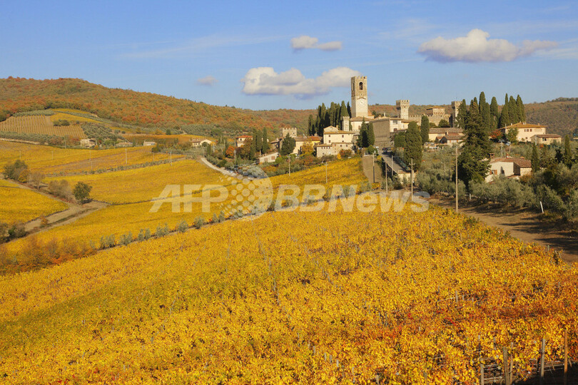 イタリア中部トスカーナ(Tuscany)州パッシニャーノ(Passignano)のぶどう畑は紅葉の季節を迎えた。パッシニャーノはワイン、キャンティ・クラシコ(Chianti Classico)の産地として知られている(2011年11月2日撮影)。(c)AFP/FABIO MUZZI
