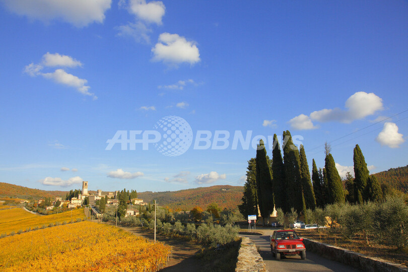 イタリア中部トスカーナ(Tuscany)州パッシニャーノ(Passignano)のぶどう畑は紅葉の季節を迎えた。パッシニャーノはワイン、キャンティ・クラシコ(Chianti Classico)の産地として知られている(2011年11月2日撮影)。(c)AFP/FABIO MUZZI