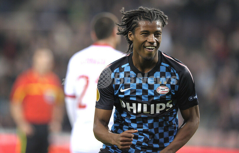 前半12分に同点ゴールを決めて歓喜するPSVアイントホーフェンのジョルジニオ・ヴィナルドゥム(Georginio Wijnaldum、2011年11月3日撮影)。(c)AFP/MARCE VAN HOORN