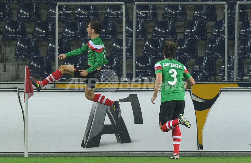 前半37分に先制点を挙げて歓喜するアスレティック・ビルバオのアンデル・エレーラ( Ander Herrera、2011年11月3日撮影)。(c)AFP/JOE KLAMAR