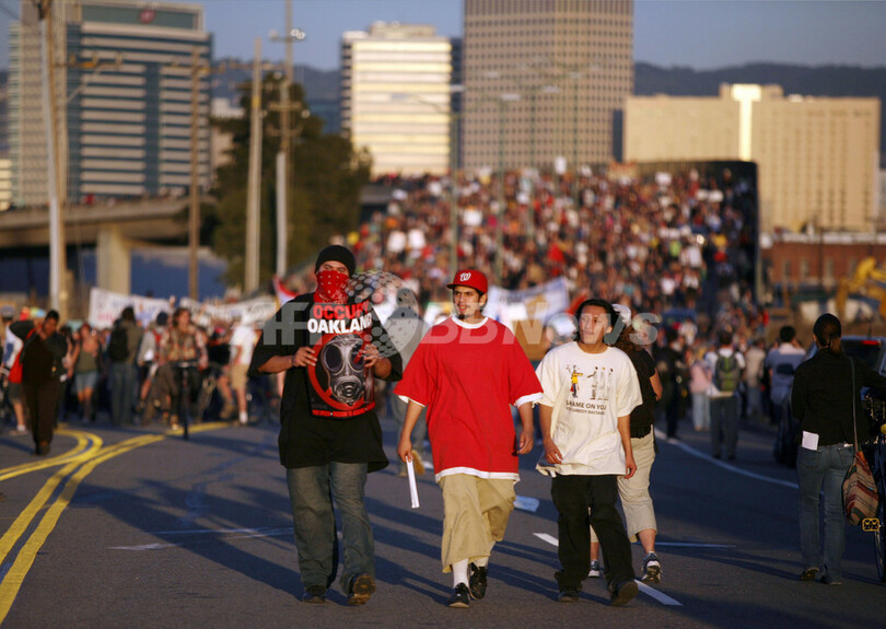 オークランドでは前週、抗議行動参加者らのテントを警官隊が強制撤去した。この時に警官隊が催涙弾を使用し、1人が負傷したことから、市中心部で2日昼、これに抗議するデモ行進が行われた。