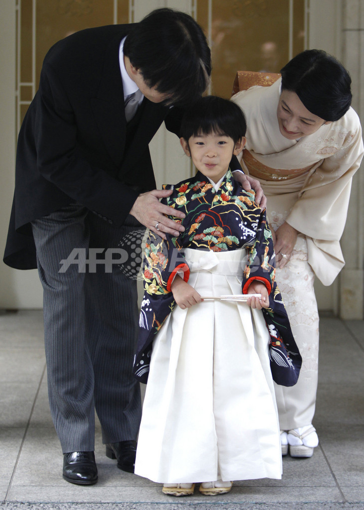 写真は、儀式を終えた悠仁さま(中央)と秋篠宮ご夫妻。赤坂御用地にて(2011年11月3日撮影)。(c)AFP/POOL/Issei Kato