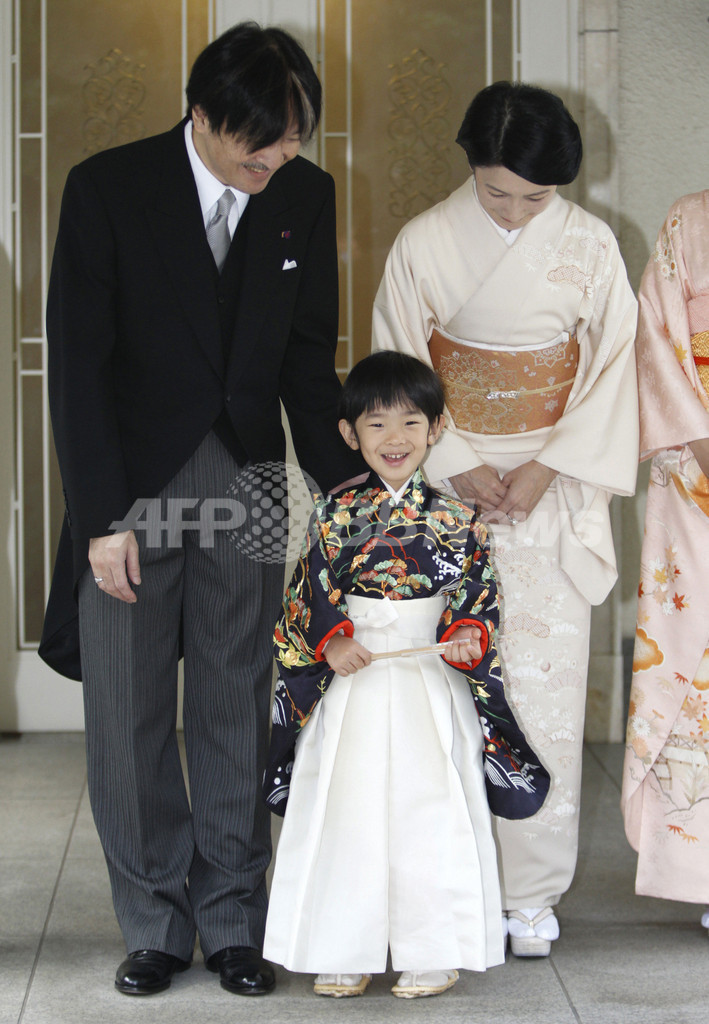 写真は、儀式を終えた悠仁さま(中央)と秋篠宮ご夫妻。赤坂御用地にて(2011年11月3日撮影)。(c)AFP/POOL/Issei Kato