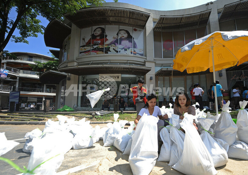 政府は全力を尽くしてバンコク中心部を洪水から守ると宣言しているが、市内の警戒レベル情報が混乱したことから批判されている。(c)AFP