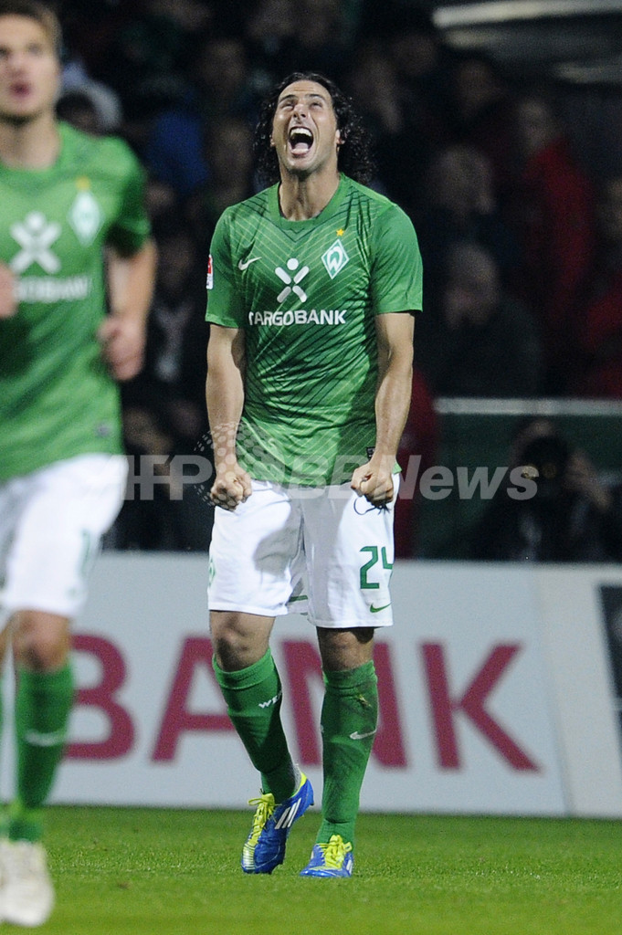 ゴールを決め歓喜するヴェルダー・ブレーメンのクラウディオ・ピサロ(Claudio Pizarro、2011年11月5日撮影)。(c)AFP/OLIVER HARDT