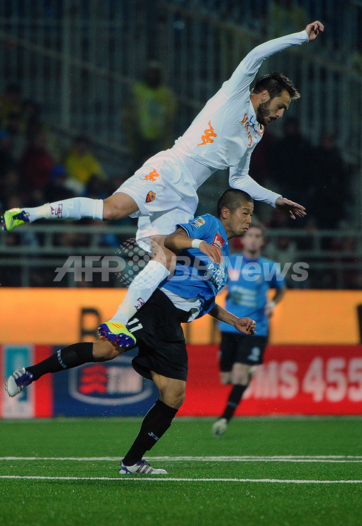 ボールを競るノヴァーラの森本貴幸(Takayuki Morimoto、右)とローマのマルコ・カッセッティ(Marco Cassetti、2011年11月5日撮影)。(c)AFP/OLIVIER MORIN