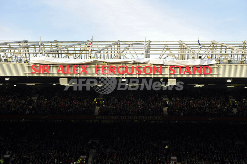 偉業を記念し『サー・アレックス・ファーガソン・スタンド(Sir Alex Ferguson Stand)』と命名されたマンチェスター・ユナイテッド本拠地のオールド・トラフォード(Old Trafford)の北側スタンド(2011年11月5日撮影)。(c)AFP/GLYN KIRK