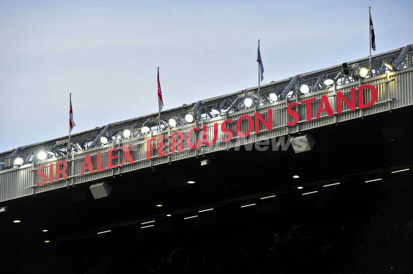 偉業を記念し『サー・アレックス・ファーガソン・スタンド(Sir Alex Ferguson Stand)』と命名されたマンチェスター・ユナイテッド本拠地のオールド・トラフォード(Old Trafford)の北側スタンド(2011年11月5日撮影)。(c)AFP/GLYN KIRK