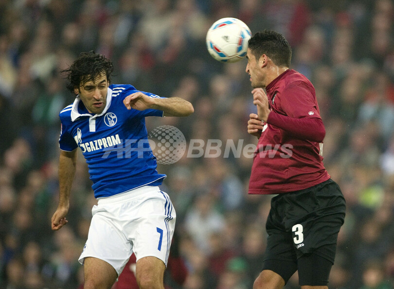 ハノーバーのカリム・ハグイ(Karim Haggu)とボールを競るシャルケのラウル・ゴンザレス(Raul Gonzalez、2011年11月6日撮影)。(c)AFP/ODD ANDERSEN