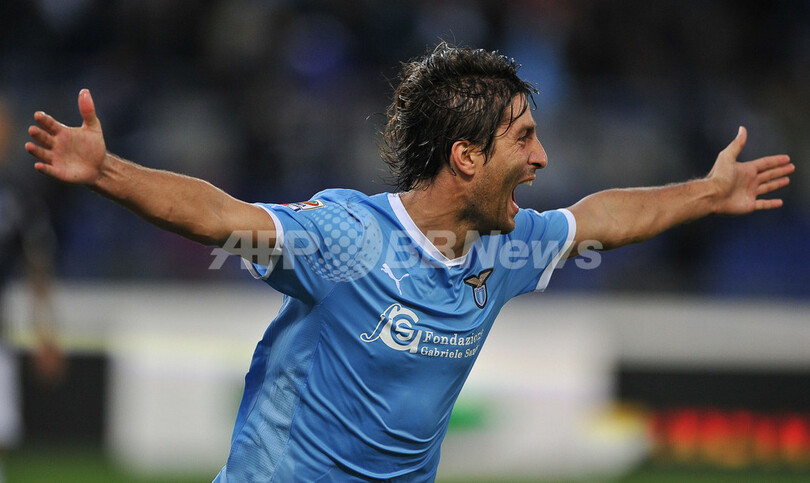 後半39分に決勝点を挙げて歓喜するラツィオのジュゼッペ・スクッリ(Giuseppe Sculli、2011年11月6日撮影)。(c)AFP/ANDREAS SOLARO
