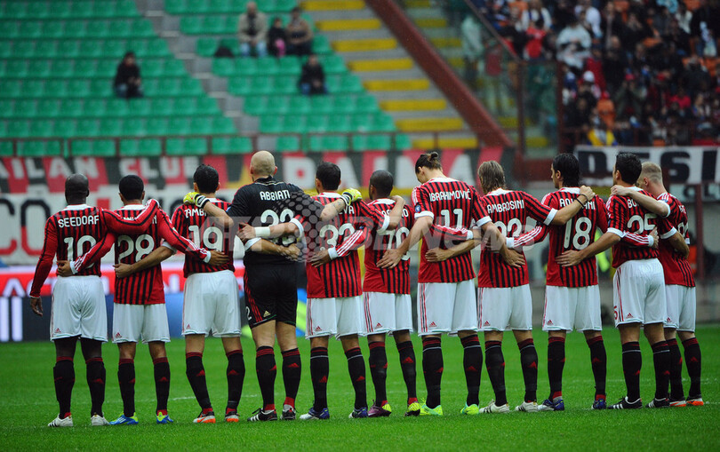 試合前、ジェノバ(Genoa)で発生した洪水の犠牲者に黙祷を捧げるミランの選手(2011年11月6日撮影)。(c)AFP/OLIVIER MORIN