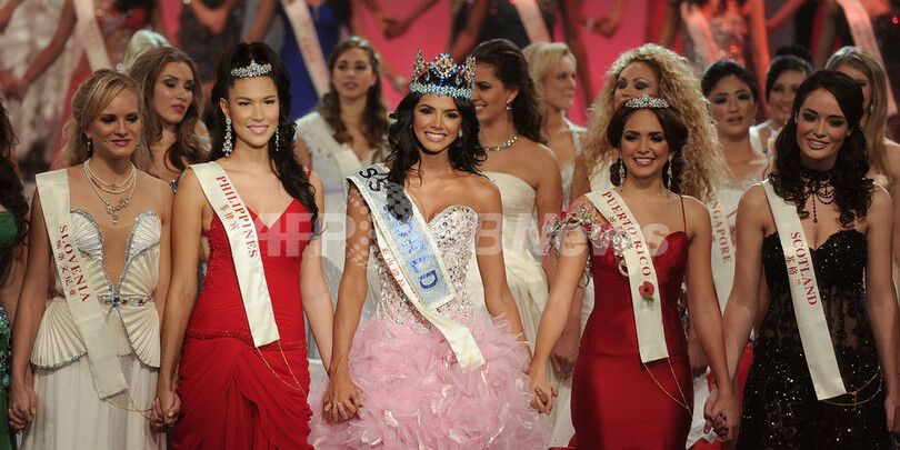 ミス・ワールド(Miss World)世界大会が6日、英ロンドン(London)で開催され、ベネズエラ代表のイビアン・サルコス(Ivian Sarcos)さんが栄冠に輝いた。今年は史上最多の122人が参加し、大会の模様は世界150か国以上で生中継された。写真は、サルコスさん(中央)と最終選考に残った出場者たち(2011年11月6日撮影)。(c)AFP/BEN STANSALL