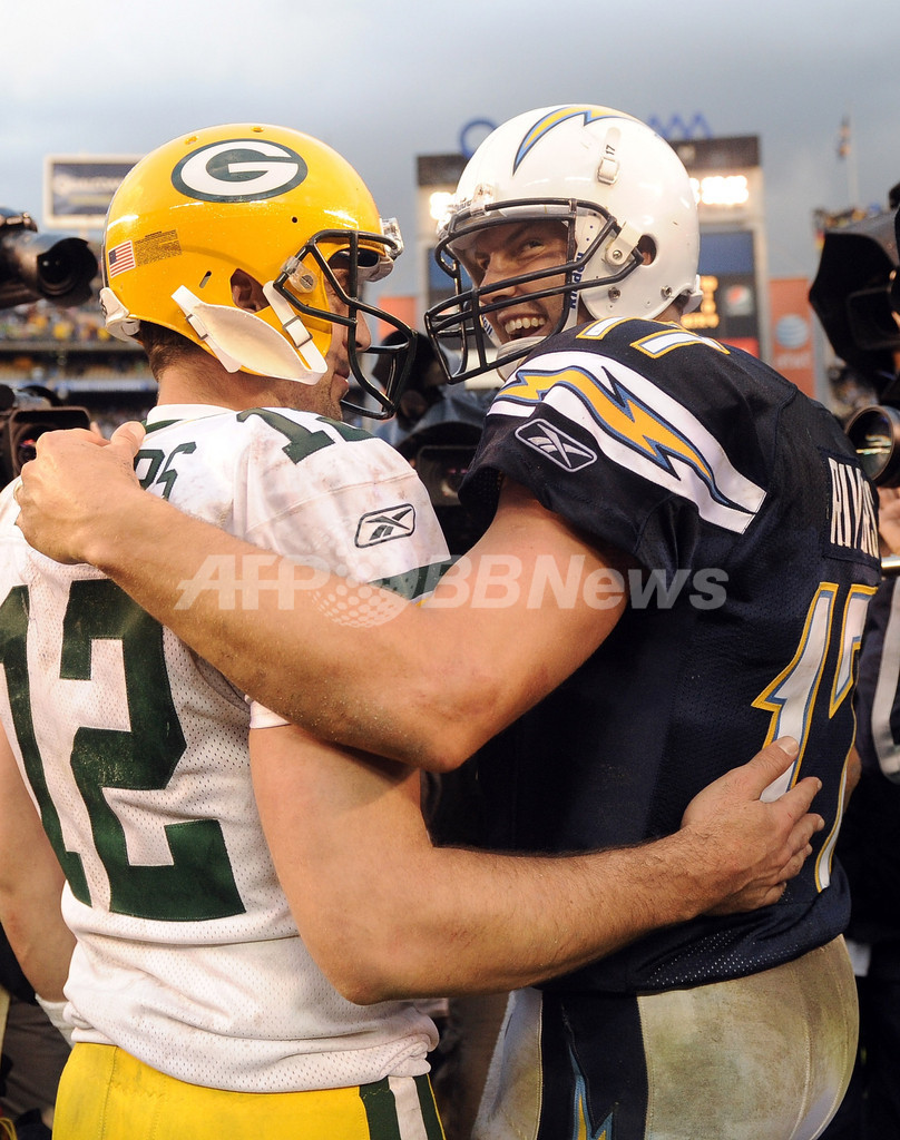 試合後に言葉を交わすチャージャーズのQBフィリップ・リバース(Philip Rivers、右)とパッカーズのQBアーロン・ロジャース(Aaron Rodgers、2011年11月6日撮影)。(c)AFP/Getty Images/Harry How