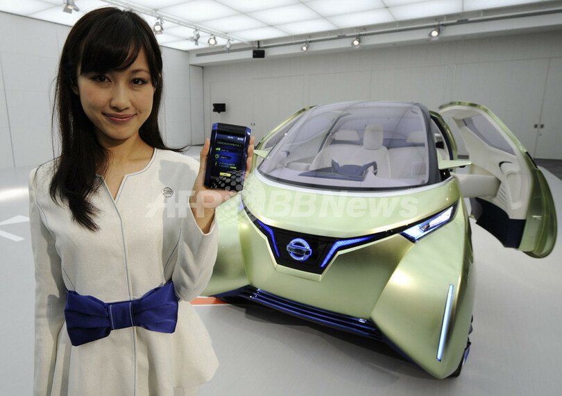 写真は、神奈川県厚木市の日産のデザインセンターで展示された「Pivo3」と、次世代駐車場AVPでPivo3を呼び出すことのできるスマートフォン(2011年10月20日撮影)。(c)AFP/TOSHIFUMI KITAMURA