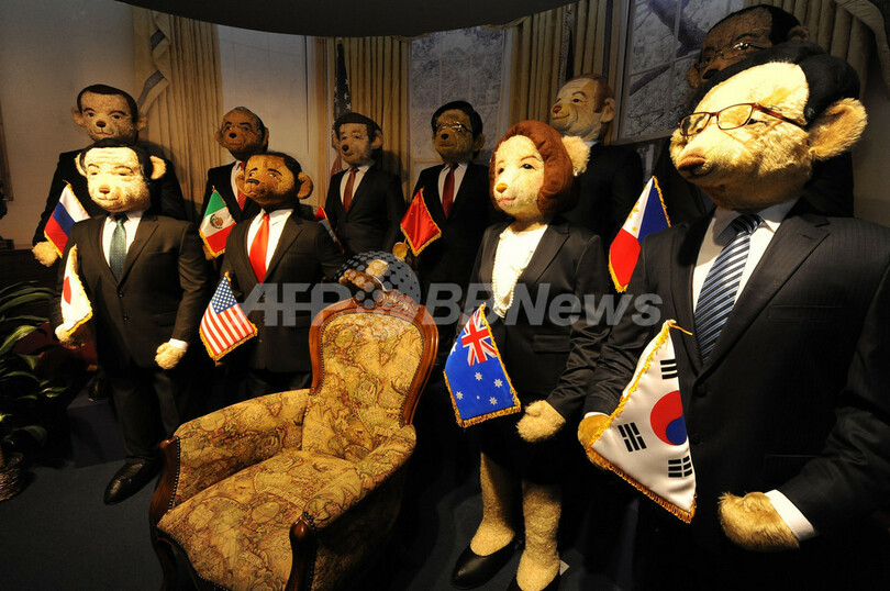 【11月12日 AFP】ハワイ・ホノルル(Honolulu)にある博物館「テディベアワールド(Teddy Bear World)」に9日、同地で間もなく開幕するアジア太平洋経済協力会議(APEC)首脳会議に出席する首脳らをかたどった等身大ベアがお目見えした。
