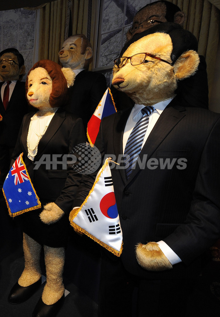 【11月12日 AFP】ハワイ・ホノルル(Honolulu)にある博物館「テディベアワールド(Teddy Bear World)」に9日、同地で間もなく開幕するアジア太平洋経済協力会議(APEC)首脳会議に出席する首脳らをかたどった等身大ベアがお目見えした。