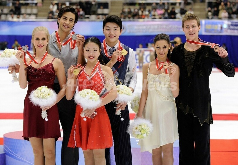 表彰式に臨む(左から)2位に入ったカナダのケイトリン・ウィーバー(Kaitlyn Weaver)/アンドリュー・ポジェ(Andrew Poje)組、優勝したマイア・シブタニ(Maia Shibutani)/アレックス・シブタニ組ロシアのエレーナ・イリニフ(Elena Ilinykh)/ニキータ・カツァラポフ(Nikita Katsalapov)組(2011年11月12日撮影)。(c)AFP/Toru YAMANAKA
