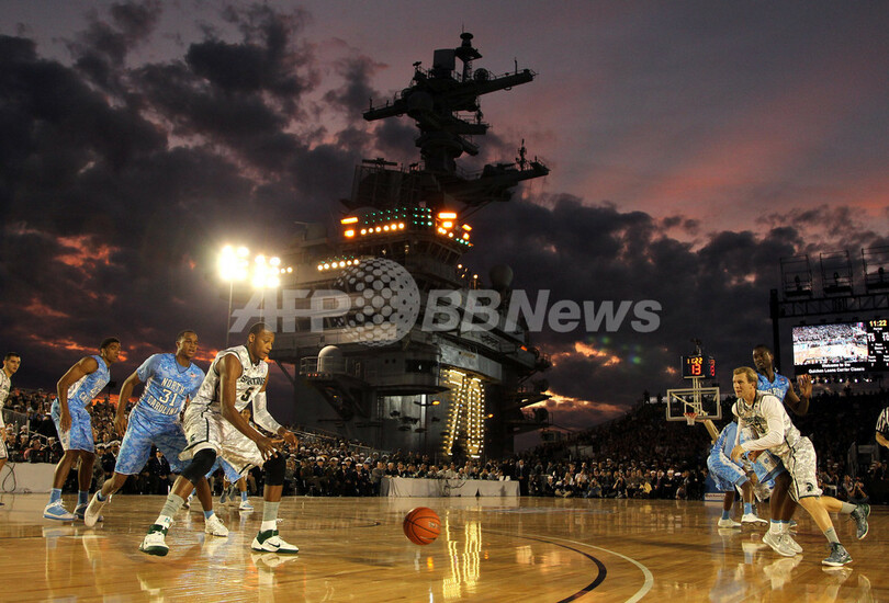 全米大学体育協会(NCAA)「キャリアクラシック(Carrier Classic)」の試合は、ミシガン(Michigan)州のステート・スパルタンズ(State Spartans)とノースカロライナ(North Carolina)州のタール・ヒールズ(Tar Heels)が対戦。バスケットコートは空母の飛行甲板に設営された。(c)AFP