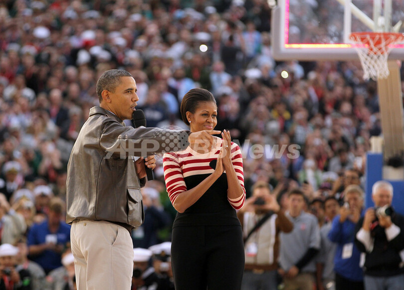 写真は、試合前に演説するオバマ大統領とミシェル夫人(2011年11月11日撮影)。(c)AFP/Getty Images/Ezra Shaw