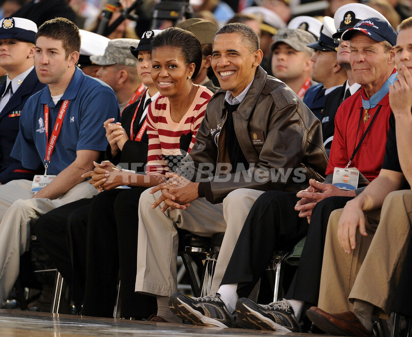 【11月13日 AFP】バラク・オバマ(Barack Obama)米大統領とミシェル夫人(Michelle Obama)は11日、米カリフォルニア(California)州サンディエゴ(San Diego)に停泊中の米空母カール・ビンソン(USS Carl Vinson)艦上で開かれた米大学男子バスケットボールの試合を観戦した。