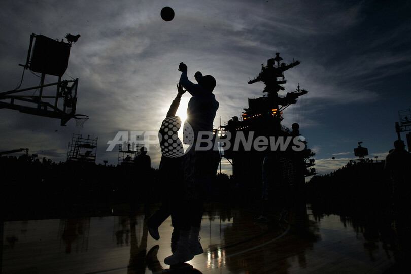 全米大学体育協会(NCAA)「キャリアクラシック(Carrier Classic)」の試合は、ミシガン(Michigan)州のステート・スパルタンズ(State Spartans)とノースカロライナ(North Carolina)州のタール・ヒールズ(Tar Heels)が対戦。バスケットコートは空母の飛行甲板に設営された。(c)AFP