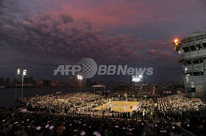 全米大学体育協会(NCAA)「キャリアクラシック(Carrier Classic)」の試合は、ミシガン(Michigan)州のステート・スパルタンズ(State Spartans)とノースカロライナ(North Carolina)州のタール・ヒールズ(Tar Heels)が対戦。バスケットコートは空母の飛行甲板に設営された。(c)AFP